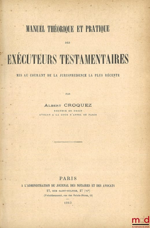, Paris, L’Administration du Journal des Notaires et des Avocats 1913, in-8, demi-toile brune, tit. doré sur dos lisse orné de doubles filets dorés, (usé, accroc sur la tranche, des soulignures au crayon), 46p.