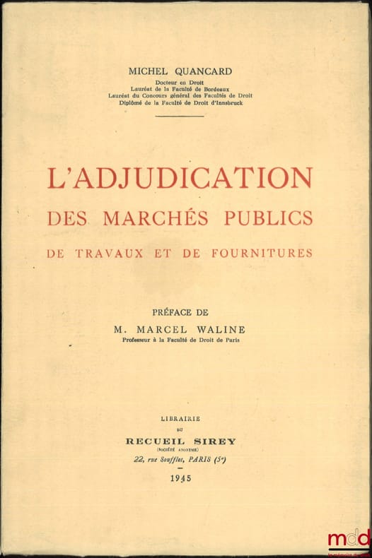 , Paris, Sirey 1945, in-8, br., non rogné, ENVOI DE L’AUTEUR AU PROFESSEUR WALINE, (dos insolé), intérieur très frais, [ce livre provient de la bibliothèque personnelle de Marcel et Jean Waline], VIII-399p.