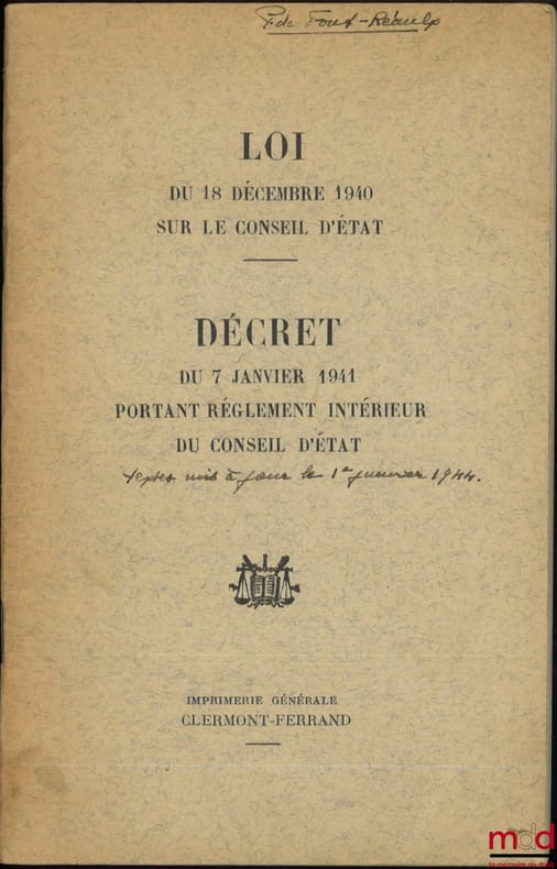 , Clermont-Ferrand, Imp. générale 1941, in-8, fascicule agrafé, (nb. annotations à l’encre de Pierre de Font-Réaulx), bon état, [Cet ouvrage provient de la bibliothèque personnel de Pierre de Font-Réaulx], 48p.