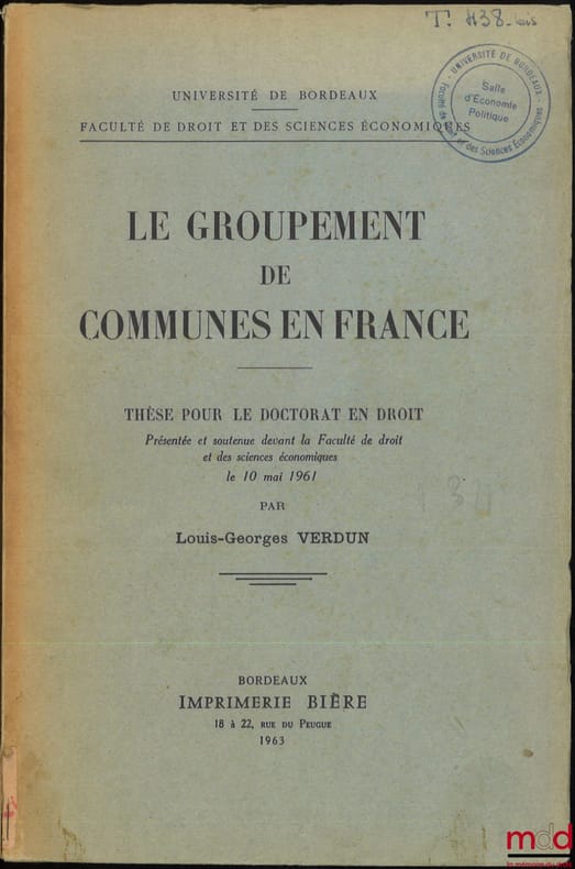 , Bordeaux, Imp. Bière 1963, in-8, br., partielt non coupé, (dos insolé, marque de bibl.), int. frais, 252p.