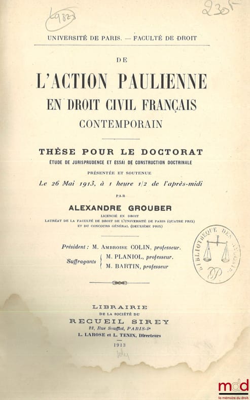 , Paris, Sirey 1913, in-8, demi-toile grenat, tit. doré sur dos lisse orné de double filets dorés soulignants, tr. mouchetées, (dos insolé, des mouillures à l’int., qq. annotations au crayon), 672p.