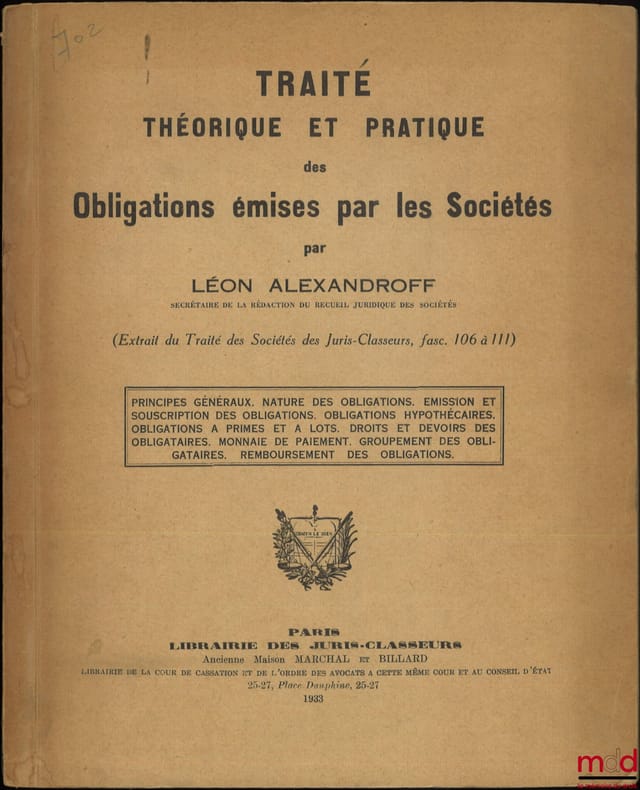 , Paris, Librairie des Juris-Classeurs 1933, in-8, br., bon état, 6/ 20/ 40/ 26/ 18/ 62/ 58/ 43p.