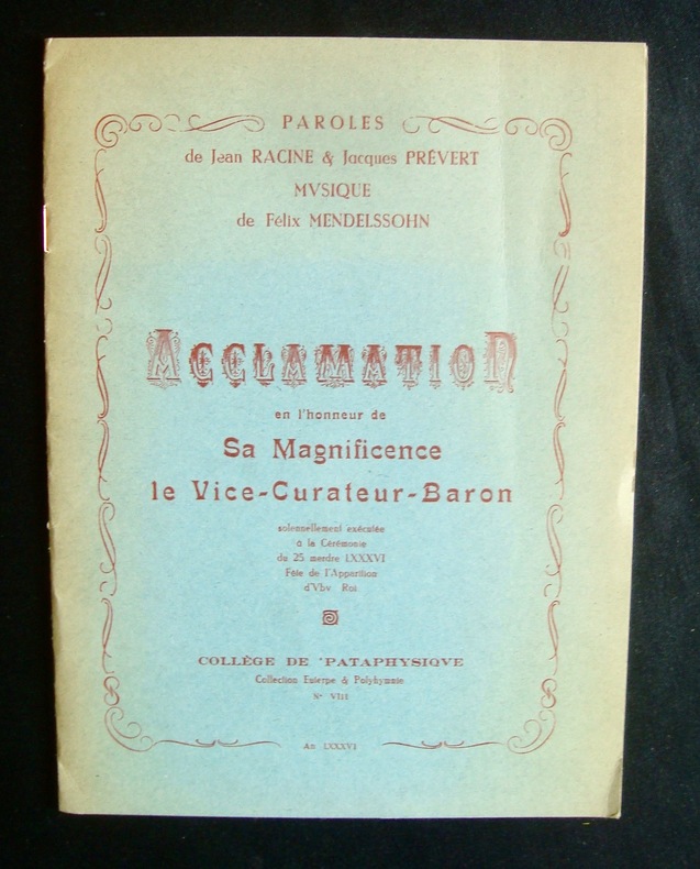 Paroles de Jean Racine et Jacques Prévert - Musique de Félix Mendelssohn - Paris : Collège de Pataphysique (Collection "Euterpe & Polyhymnie"), 19 mai 1959 - Plaquette agrafée 15,5x20,5 cm, sous couverture bleue imprimée en rouge de 8 pages - tirage à 555 exemplaires - bon état - exemplaire marqué du sceau de la chandelle verte - joint la lettre annuelle aux Optimates -