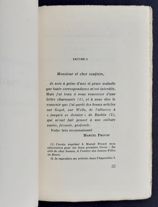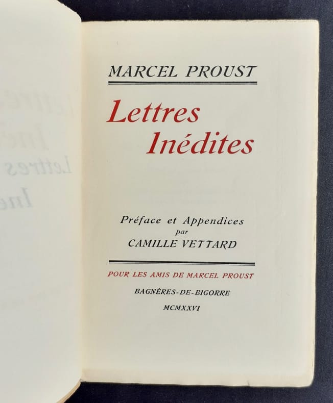 Préface et appendices par Camille Vettard - Bagnères-de-Bigorre : "Pour les Amis de Marcel Proust" (Maurice Péré imprimeur), 1926 - in-12 broché, 149 pages - édition originale tirée à 2010 exemplaires : 1/1913 exemplaire sur vélin Lafuma - bon état -