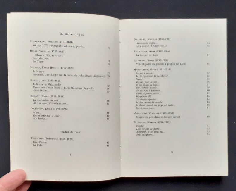 Gallimard Paris, Gallimard, 1981. In-8 broché de 153 pages. Raimbaut de Vaqueiras, Pétrarque, Lope de Vega, Shakespeare, Blake, Shelley, Keats, Emiliy Brontë, Emily Dickinson, Tioutchev, Goumilev, Anna Akhmatova, Pasternak, Mandelstam, Maïakovsk, Marina Tsvétaeva, Hernandez. Très bon état