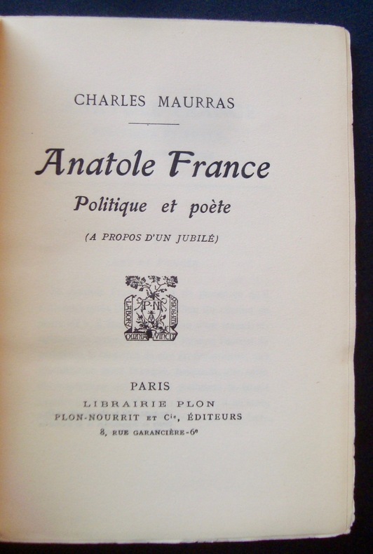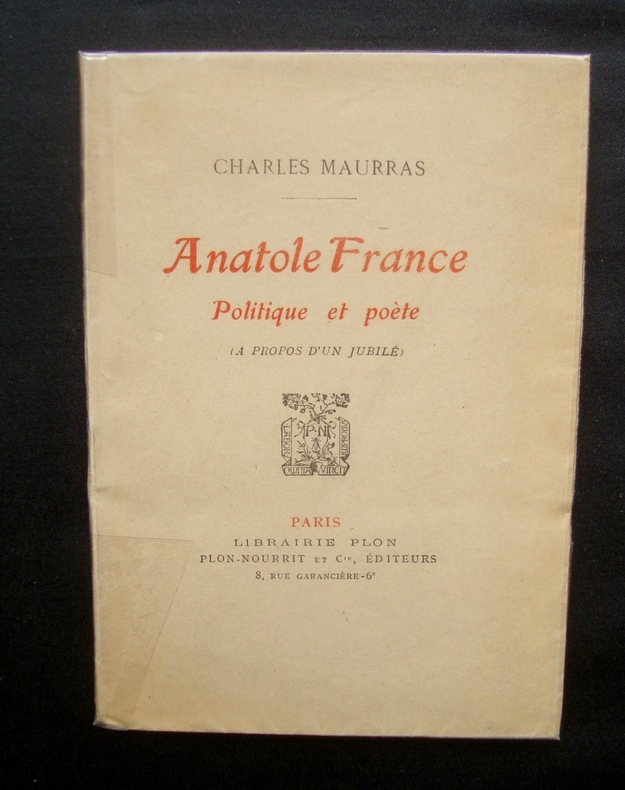 Paris, Plon, 1924 ; in-12, 55 pp., broché. Anatole France était un écrivain de la fin du XIXème et du début du XXème siècle. Il a reçu le Prix Nobel de littérature, en 1921. Il a accompagné la Troisième République aussi bien en tant qu'écrivain qu'en tant que critique littéraire. Il a pris part à la demande de révision du procès de Dreyfus. Anatole France avait une conscience sociale développée, il était proche de la SFIO, mais reste critique envers le parti communiste. Il a publié de très nombreux ouvrages. Très bon état.