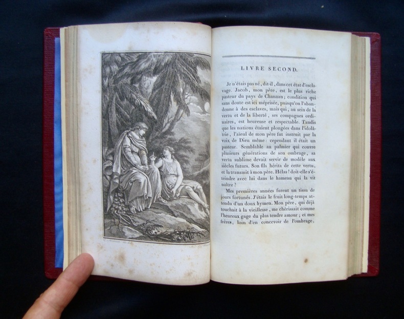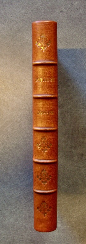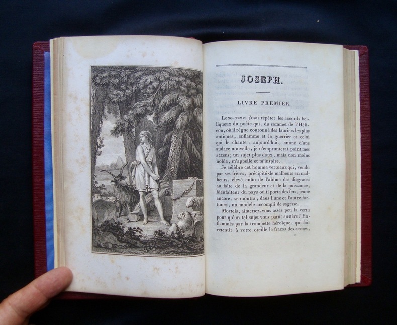 Chez Jean Neaulme, A La Haye, 1757.Petit in-folio broché de (4)-22 pages sous chemise. La chemise papier est récente. Le livre est en partie débrochée. La page de titre est salie. Et des pages sont tachées au bas de la page. IL MANQUE DEUX GRAVURES SUR LES DIX QUE DOIT CONTENIR CET OUVRAGE.Seule édition de ce livre destiné à l'éducation morale et artistique de la jeunesse, normalement illustré de 10 figures d'après Rembrandt : 1, Joseph raconte ses songes. 2, Joseph est descendu dans la cisterne. 3, Joseph est vendu à des marchands Ismaelites. 4, Jacob s'aflige à la veue de la robbe de Joseph qu'il croit mort.5. Chasteté de Joseph.6, La femme de Putiphar accuse Joseph devant son mari.7, Joseph dans la prison. 8, Joseph explique les songes de Pharaon. 9, Joseph Gouverneur d'Egypte. 10, Joseph est reconnu par ses frères. IL MANQUE LES FIGURES 1 ET 7.Les figures sont toutes gravées par le comte de Caylus et reproduisent à la même dimension une série de dessins trouvée dans la collection de son ami, le peintre Charles-Antoine Coypel. Ces figures ont été gravées avant 1752 puisqu'elles sont mentionnées dans le catalogue posthume de la vente Coypel (avril 1753). Jusqu'à l'acquisition des dessins par le musée du Louvre en 1842, leur attribution à Rembrandt ne fut jamais remise en cause. Après plusieurs propositions sur le véritable auteur des dessins, ils furent attribués en 1933 à Gerbrand van den Eeckhout, ami et élève préféré de Rembrandt, qui les exécuta de 1664 à 1666.