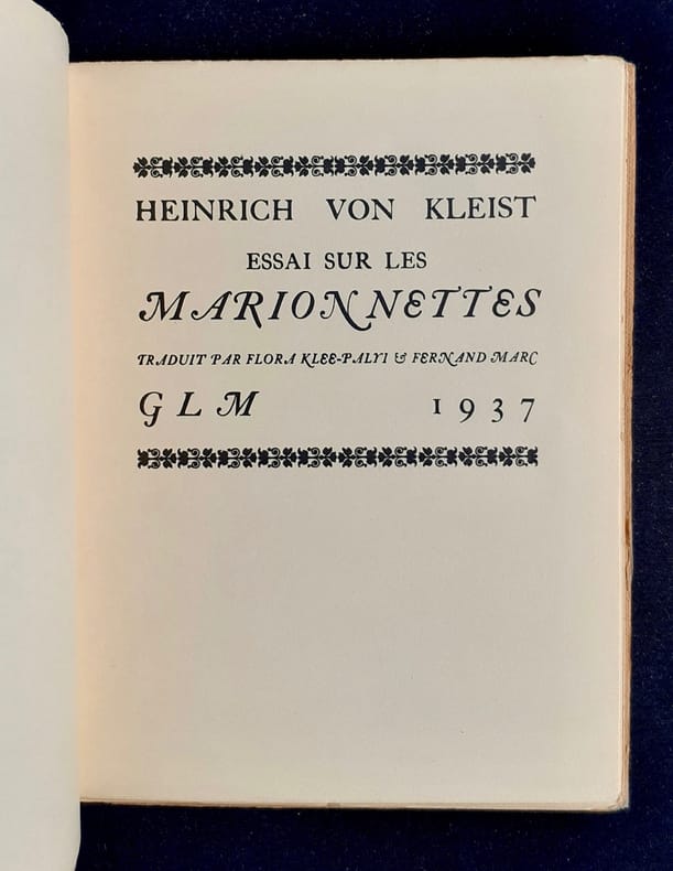 Traduit par Flora Klee-Palvi et Fernand Marc - Paris : Guy Levis Mano (GLM), juin 1937 - un volume 12,8x17cm, de (26) pages - Edition originale de la traduction tirée à 367 exemplaires : 1/330 numérotés sur papier vélin - Petit manque en haut et bas du dos sinon bon état.