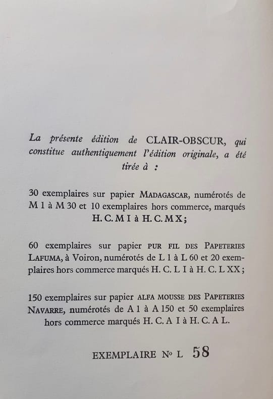 Monaco : Editions du Rocher, 1954. Un volume broché 14x20 cm, 200 pages. Edition originale : un des 60 exemplaires sur pur fil Lafuma, deuxième grand papier après 30 exemplaires sur Madagascar. Bon état.