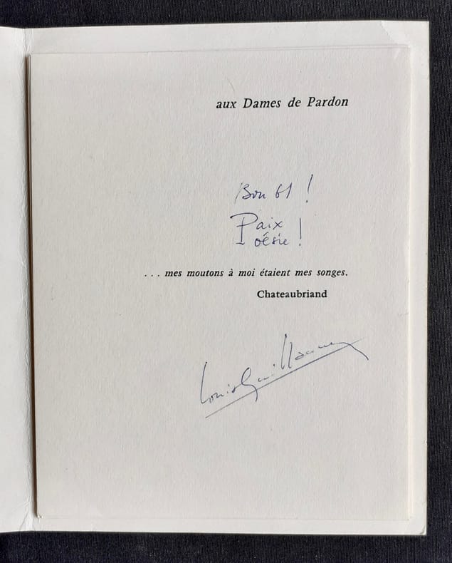 Aux Trois Volcans, 1960 - 5 feuillets imprimées au recto seulement sous chemise imprimée (11,7x15 cm) - bon état - Exemplaire avec un envoi autographe signé de l'auteur -