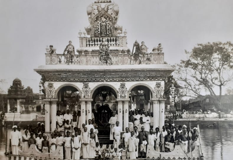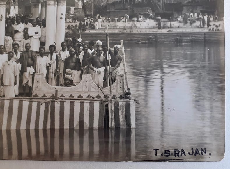 Rameshwaram (Tamil Nadu - Inde) : Cérémonie du Ramalinga Pratishtha, circa 1920 - Tirage original d'un temple sur l'eau avec un groupe de pélerin faisant face à l'objectif à l'occasion de la cérémonie religieuse de Ramalinga Pratishtha - Photographie créditée T.S. Rajan au timbre humide au coin inférieur droit, montée sous marie-louise et sur papier fort - bon état -