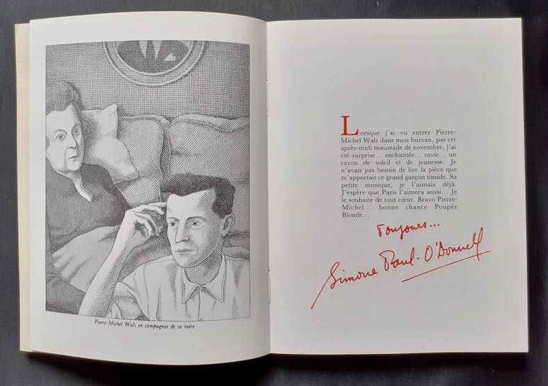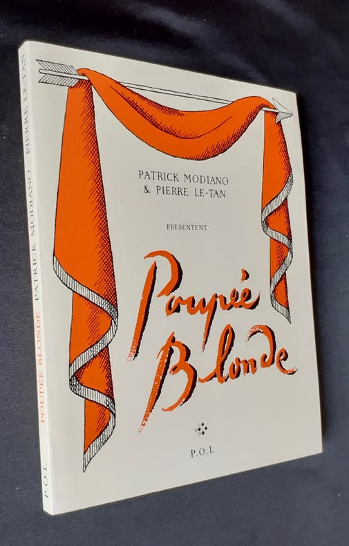 Paris P.O.L. 1983 In-8, broché, couverture rempliée et illustrée en deux couleurs par Pierre Le-Tan.Edition originale de cette pièce de théâtre (la seule écrite par Patrick Modiano), narrant lhistoire de cinq amis qui, à vingt ans, ont créé un groupe de chanteurs, les Peter Pan, et se retrouvent vingt ans plus tard; certains sont morts et viennent, fantômes figés dans leur costume d'époque, observer avec curiosité, dégoût parfois, ceux qui vivent toujours dans le souvenir de leur succès commun d'une saison: une chanson qui s'appelait Poupée blonde... Cette édition a été illustrée par Pierre Le-Tan de compositions imprimées en noir et rouge, à la façon dun programme de théâtre en 1950, avec les dessins des décors et des costumes, les publicités et la présentation de lauteur, de la directrice dudit théâtre et des acteurs. Il na pas été tiré d'exemplaires sur grand papier. Exemplaire enrichi sur le faux titre d'un envoi autographe signé de Pierre Le-Tan et contresigné par Patrick Modiano adressé à l'écrivain Anne de Margerie.