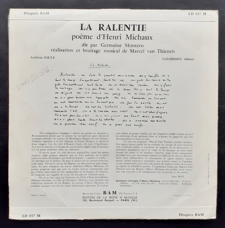 Paris : Guy Lévis Mano (12ème cahier de la Collection "Habitude de la poésie"), 1937. Un volume (13,8x9,4cm) agrafé de 16 pages. Edition originale. + disque : Poème d'Henri Michaux dit par Germaine Montero. Réalisation et bruitage musical de Marcel van Thienen. Paris: Éditions de la Boîte à Musique (Disques BAM LD 037 M / Archives O.R.T.F.), sans date (ca 1958). Disque 33 tours au format 25 cm. Pochette illustrée par H. Mottis. Fac-similé d'un extrait autographe au verso et présentation de Jean Roy sur deux colonnes. Les deux exemplaires en bon état.
