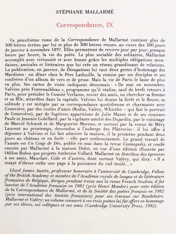 Recueillie, classée et annotée par Henri Mondor et Lloyd James Austin. Paris : Gallimard, 1983. Un volume broché (14x22,5 cm), 375 pages. Edition originale. Bon état.