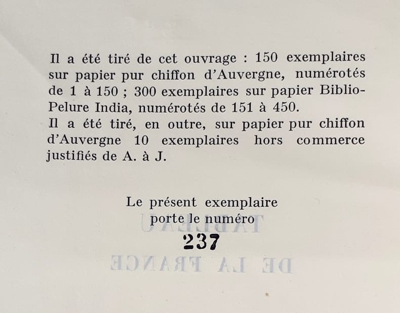 Illustré par Paul Baudier de gravures sur bois en couleurs. Belle publication imprimée à 115 exemplaires numérotés uniquement, le nôtre (60) pour le docteur Lenoir, est enrichi de quatre oeuvres originales de Pierre Baudier: un dessin et lavis d'encre de Chine et trois aquarelles, dont l'une figure en gravure à la page 75: le Rhône. On a relié à la fin le menu du dîner du "Tableau de la France" qui eut lieu au restaurant Lapérouse le 28 janvier 1937, menu comportant un petit envoi autographe de Daniel Halévy et de Paul Baudier au docteur Lenoir. Très bel exemplaire.