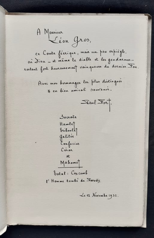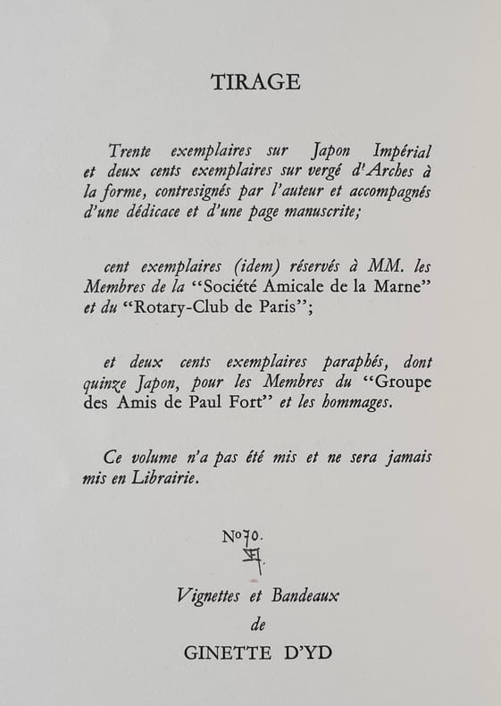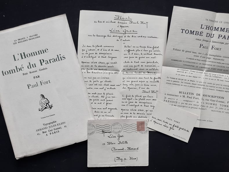 Paris : Editions Jules Klein (Collection "La France à travers les ballades françaises"), 1932. Un volume broché (19,5x29,3 cm), (60) pages. Illustré dans et hors texte par Ginette d'Yd avec un frontispice en couleurs. Belle typographie en Garamond de l'imprimeur Jules Klein. Edition originale hors commerce tirée à 330 exemplaires : un des 200 sur vergé d'Arches à la forme nominatif (M. Léon Gros) contresigné par l'auteur avec un bel envoi autographe en pleine page signé et daté de Paul Fort. Joint une lettre autographe sous forme de poème adressé au souscripteur, signée, dans son enveloppe datée de 1938 et une carte de visite autographe. Joint également le bulletin de souscription. Bon état.