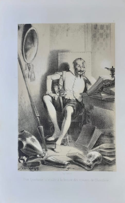 Paris : Didier, 1846 - Un volume in-8 (16x24,8cm) pleine percaline, dos lisse orné de rocailles réhaussées, titre et auteur, le tout doré, et plats orné de plaques en or réhaussées en couleurs, sur le premier plat : plaque dorée (Sancho Panza et Don Quichotte en conversation), encadrée d'une guirlande florale coloriée. tranches dorées (reliure de l'éditeur), XXIV-635 pages avec 12 lithographies en bistre par le peintre et lithographe Ange-Louis Janet, sous serpentes, et en noir dans le texte lettrines, culs-de-lampe, bandeaux - rousseurs marquées, trois tampons de bibliothèque : deux en page de titre ("fonds Gaëtan Sanvoisin") et une en dernière garde. Belle reliure romantique à la plaque, bien conservée -