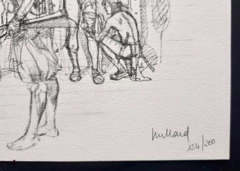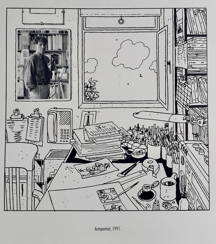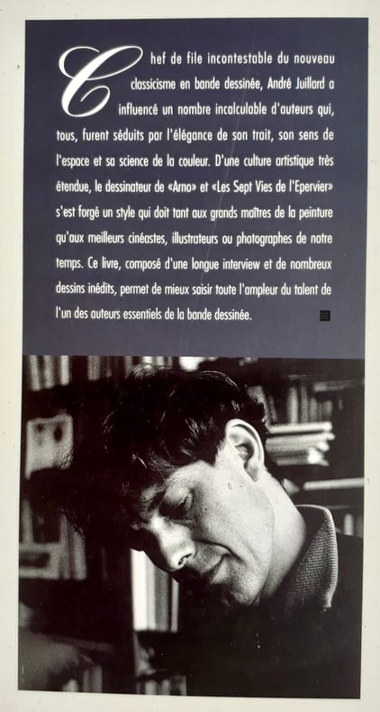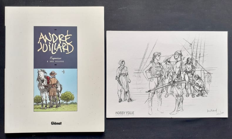 Grenoble : Editions Glénat, 1991. Un volume 23,2x29,7cm broché sous couverture illustrée en couleurs à rabats, 69 pages illustrées en noir et en couleurs sur papier couché. Edition originale de ce recueil d'entretiens entre André Juillard et Frédéric Niffle, illustré de dessins et aquarelles inédits. Très bon état. Joint une planche (21x29,5cm) d'ex-libris de Hobby Folie, numérotée 154/200 et signée : dessin extrait du tome IV de Plume au vent (2002).