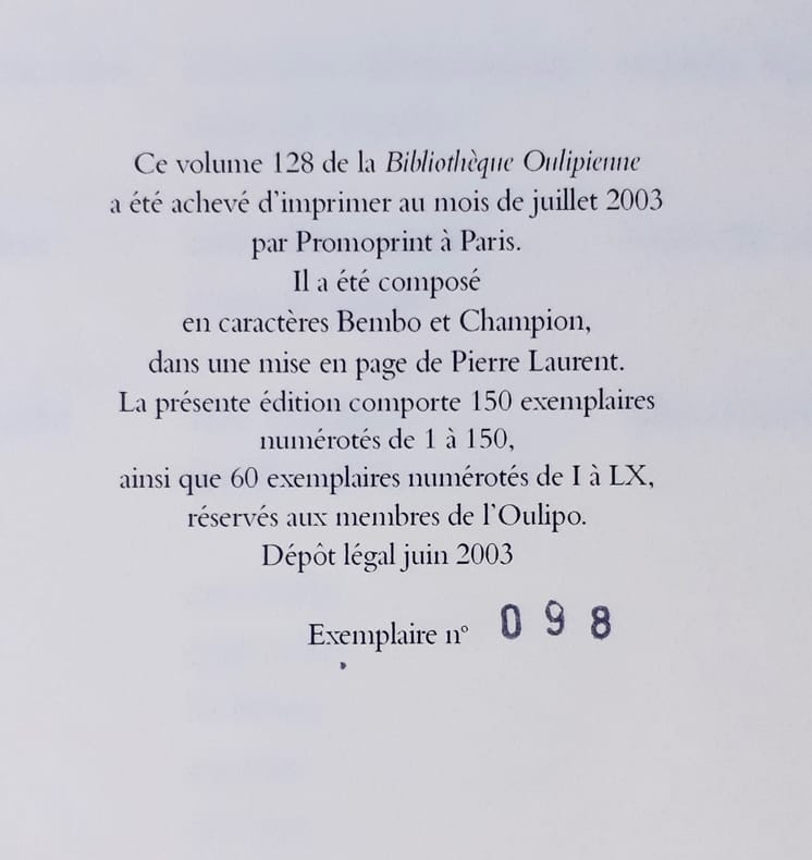 Paris : Bibliothèque Oulipienne, 2003. Un volume 14,5x21cm agrafé de 36 pages. Bon état. Edition originale numérotée tirée à 200 exemplaires.