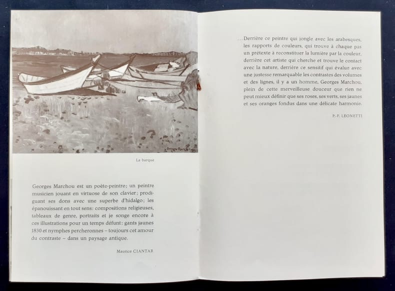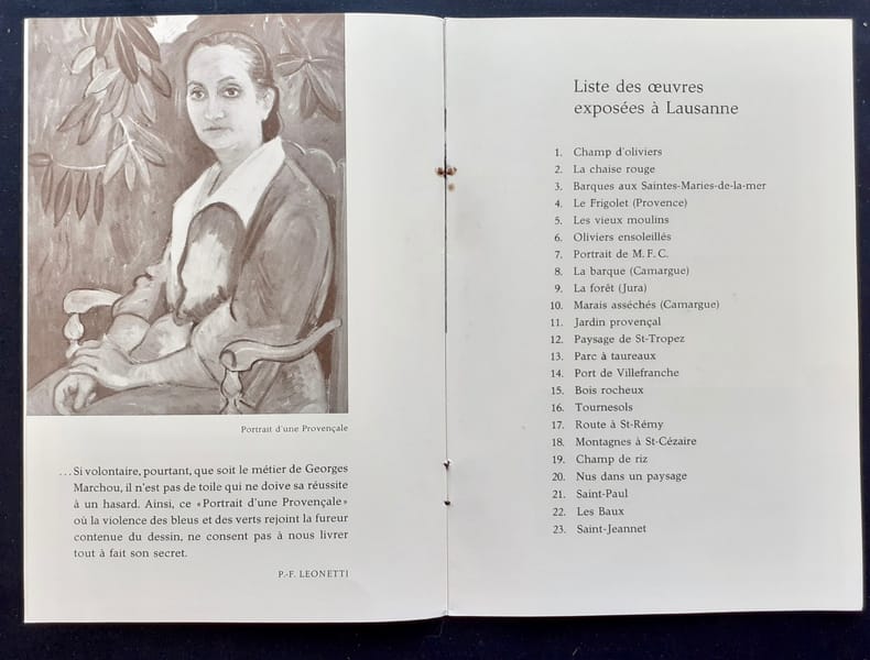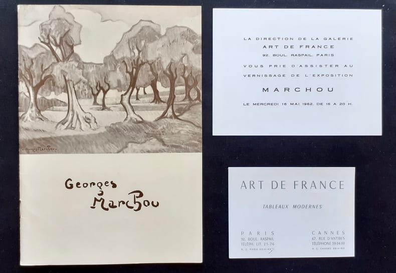 Catalogue de l'exposition présentée à Lausanne à la Galerie des Nouveaux Grands Magasins du 12 au 31 décembre 1959. Un volume (14,6x21 cm) agrafé, 12 pages illustrées. Texte de Jean Cassou et P.F. Leonetti. Joint un carton d'invitation au vernissage de l'exposition Marchou à la Galerie Art de France avec la carte de cette galerie parisienne + plaquette de présentation de 2 feuillets illustrés pour l'exposition présentée à la galerie de la Vieille Fontaine à Lausanne en 1954. Bon état.