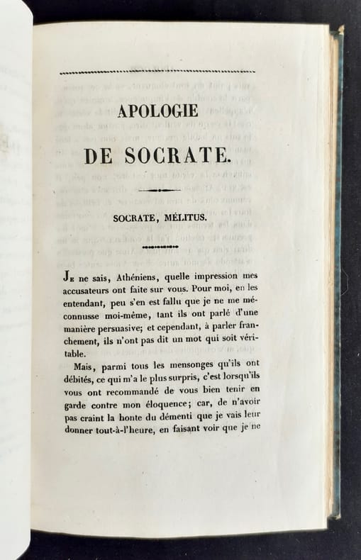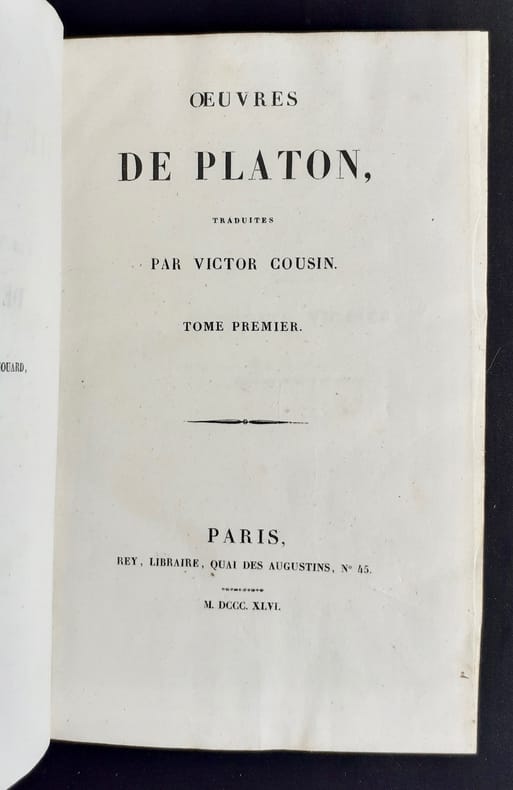 Paris : Rey libraire, imprimé chez Paul Renouard, 1846. In-8 demi-chagrin, dos à nerfs avec pièce de titre et de tomaison dorés, 368 pages. Comprend : Euthyphron ou De la sainteté, Apologie de Socrate, Criton ou Le devoir du citoyen et Phédon ou De l'âme. Bon état.