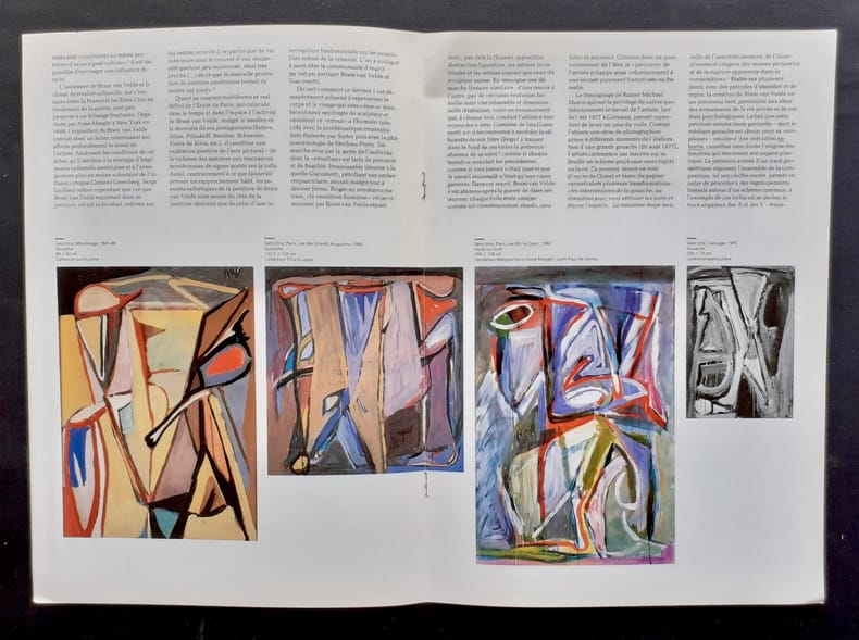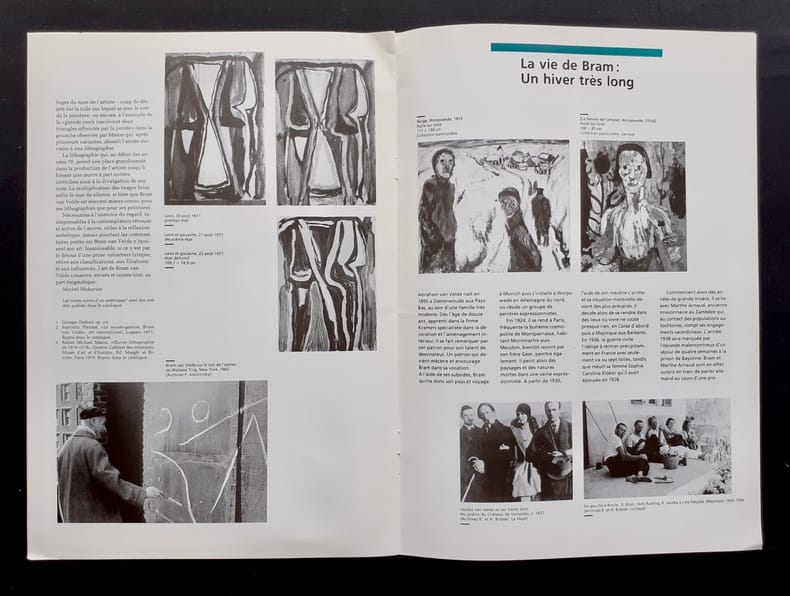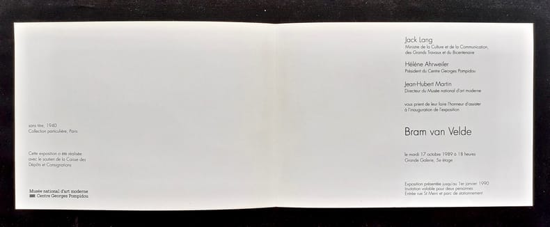 Carton d'invitation à l'inauguration en quatre volets (21x15cm) illustré en couleurs + Journal de l'exposition (21x29,7cm) de 12 pages en couleurs + dossier de presse sous chemise imprimée (21x29,7cm) de 18 pages recto. Ensemble complet en bon état. Première grande rétrospective consacrée à Bram Van Velde avec 88 huiles et gouaches dès 1922.