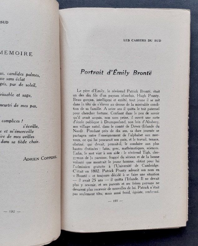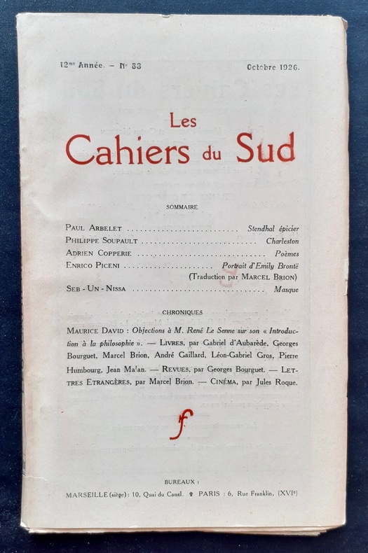 Marseille, directeur: Jean Ballard. Un volume 16,5x25,5cm agrafé, de 80 pages. Exemplaire en bon état. D’abord intitulés Fortunio, Les Cahiers du Sud furent fondés à la veille de la première guerre mondiale par Marcel Pagnol et Gabriel d’Aubarède. En 1925 la revue devient Les Cahiers du Sud, animée par Jean Ballard jusqu’en 1966 (391 numéros). Ce fut la seule revue provinciale à tenir la dragée haute à ses rivales parisiennes au premier rang desquelles La Nouvelle Revue Française.