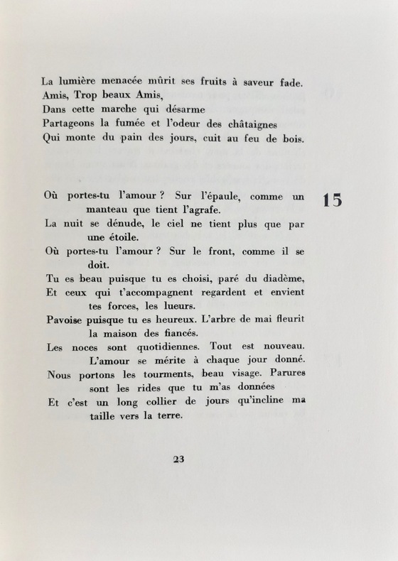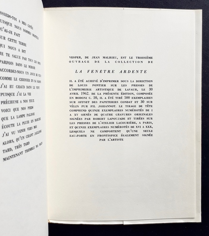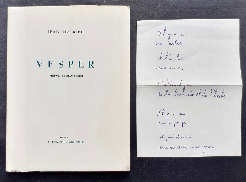Préface de Jean Tortel. Lavaur : La fenêtre ardente (Gaston Puel éditeur), 1962. Un volume broché (14,5x19,5 cm), 47 pages. Edition originale sur papier courant. Avec un court poème manuscrit de Jean Malrieu sur une feuille libre (12,5x17 cm), non signé et qui ne figure pas dans ce recueil. Bon état.