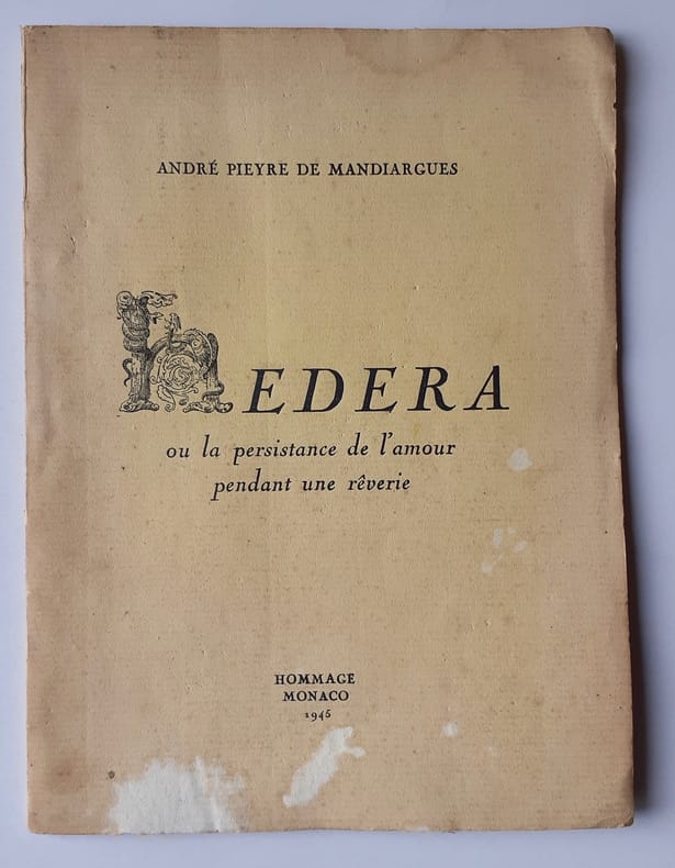 Monaco Hommage 1945 24 pp In-8 Broché Exemplaire satisfaisant 1 volume ÉDITION ORIGINALE. Tirage limité à 272 exemplaires numérotés sur vélinTrès rare exemplaire - celui-ci enrichi d'un envoi autographe de l'auteur - du second ouvrage de Pieyre de Mandiargues : poème érotique écrit à Monaco où il s'était réfugié.