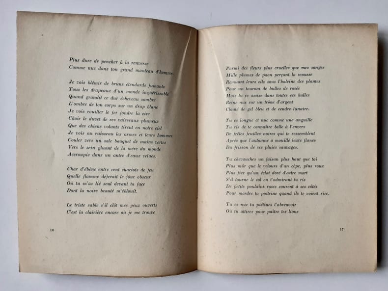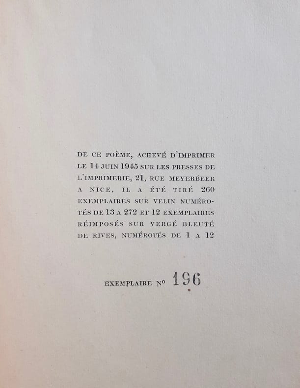 Monaco : Editions Hommage, 1945. Un volume 16,5x22,2cm broché de 30 pages non coupées. Edition originale tirée à 285 exemplaires : 1/272 ex. numéroté sur vélin. Couverture défraichie sinon intérieur en bon état. Premier livre paru de Mandiargues.
