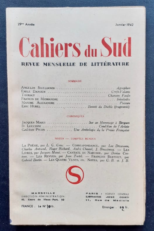 Marseille, directeur: Jean Ballard. Un volume de 80 pages. Exemplaire en bon état. Comprend notamment Hommage à Bergson de Jacques Masui.