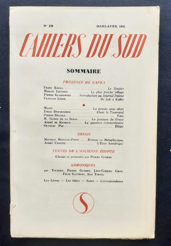 N° spécial des "Cahiers du Sud" 1945 1 vol. broché in-8, broché, pp. 121 à 261. Texte de Kafka "Le Soutier" et articles de Marcel Lecomte, Pierre Klossowski et François Léger, etc. Déchirure au dos, couverture poussiéreuse. Sinon état correct.