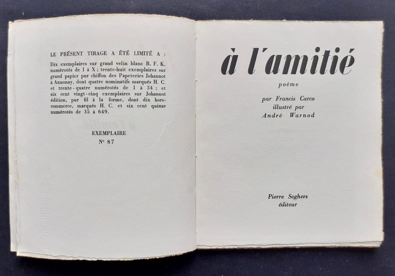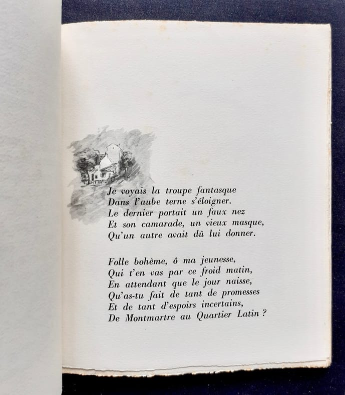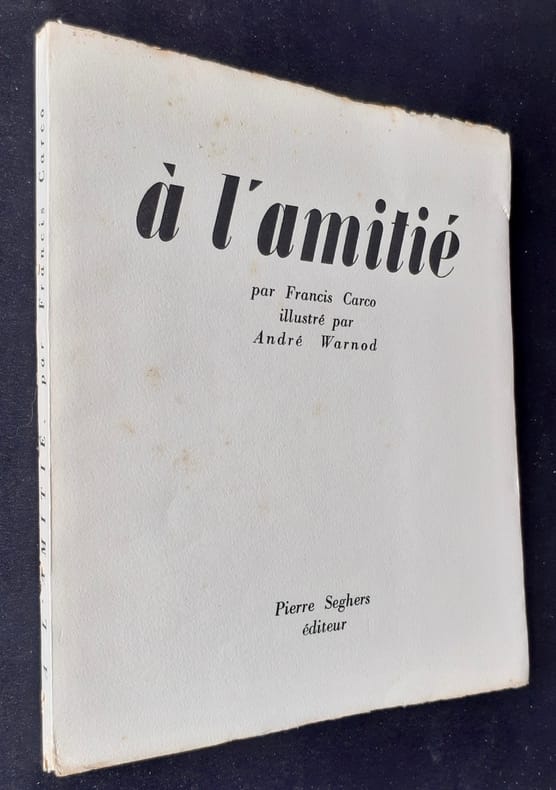 Paris : Editions Seghers, 1945. Un volume broché (21,5x17,8 cm), (68) pages. Edition originale : 1/625 exemplaires sur Johannot pur fil, n°87. Avec 7 reproductions d'André Warnod en hors texte + bandeaux et culs-de-lampe. Légères rousseurs sur la coverture sinon bon état.