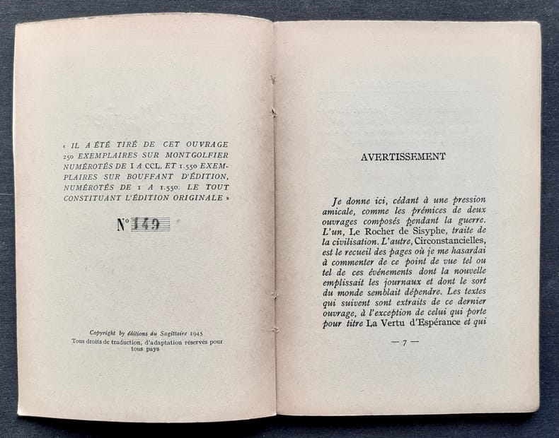 Editions du Sagittaire, décembre 1945. Un volume broché (17,4x11,9 cm), 67 pages. Edition originale : 1/1550 exemplaires numérotés sur bouffant (n°149). Bon état.