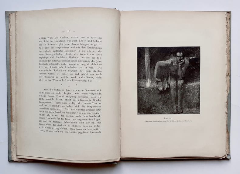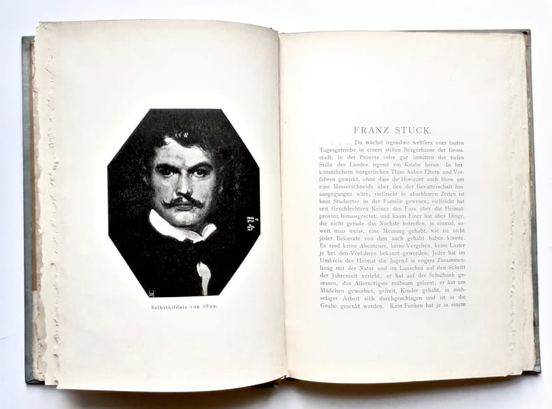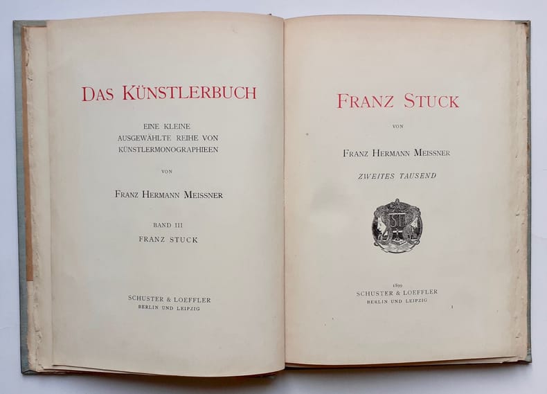 Berlin und Leipzig : Schuster & Loeffler ("Das Künstlerbuch"), 1899. Un volume 22,5x16,5cm cartonné sous couverture illustrée (d'après un dessin de Hans Thoma), 120 pages illustrées de 26 reproductions dans et hors texte. Exemplaire en bon état. Deux ex-libris gravés en pages de garde. Texte en allemand. Première monographie sur Franz Stuck.
