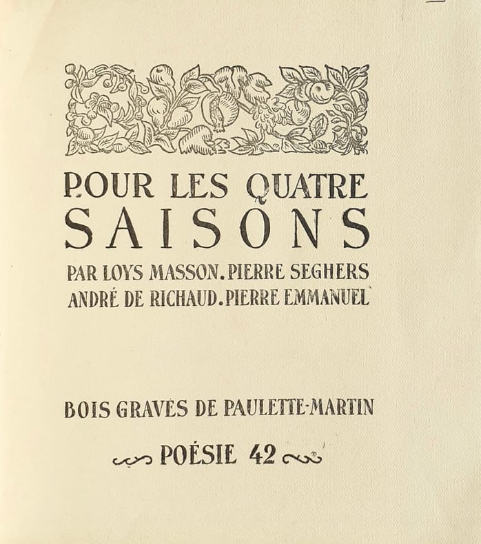 Paris : Editions Pierre Seghers / Poésie 42, décembre 1942. Un volume broché (16,2x14,8 cm), 126 pages. Avec 4 bois gravés de Paulette Martin en hors texte. Edition originale : 1/500 exemplaires sur vélin bouffant numérotés. Bon état.