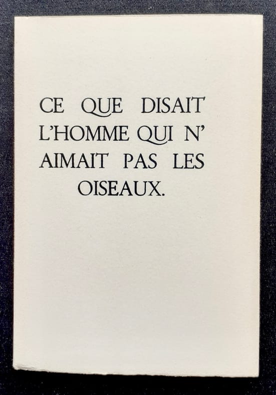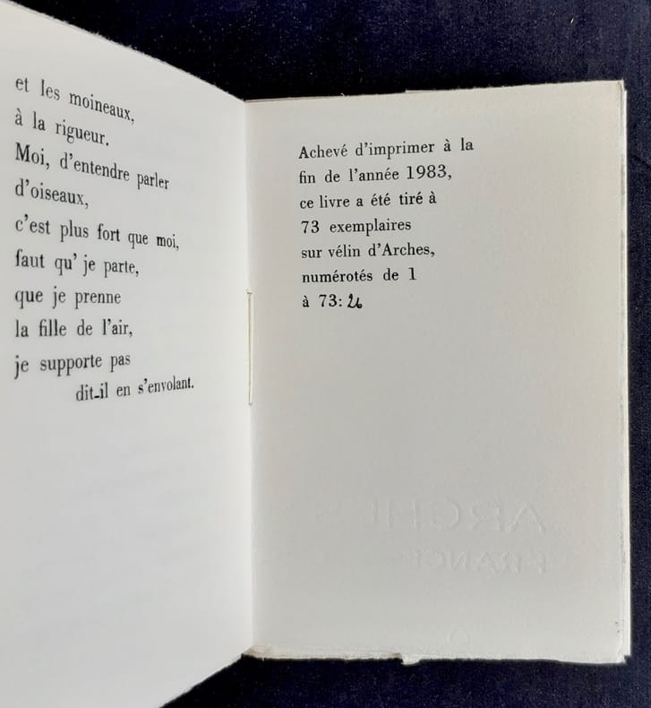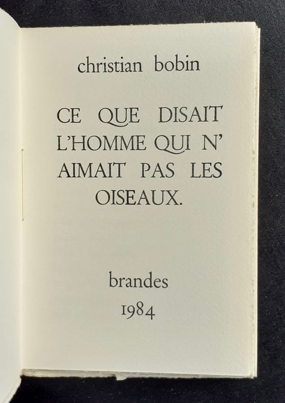 Béthune: Éditions Brandes, Laurent Debut éditeur, 1983. Un volume (10x14,5 cm) broché sous couverture à rabats, (16) pages. Édition originaletirée à seulement 73 exemplaires sur papier vélin d’Arches, celui-cijustifié à la amin n°26.