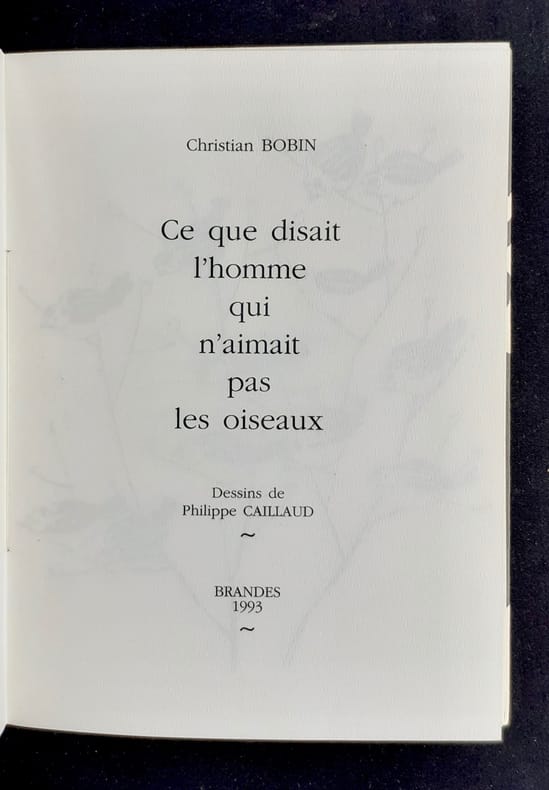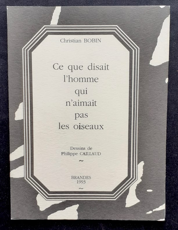 Roubaix: Éditions Brandes, 1993. Un volume broché sous couverture à rabats lithographiée (14,3x19 cm), 32 pages. Avec des dessins de Philippe Caillaud reproduits en noir dans et hors texte. Tirage ordinaire de la troisième édition.