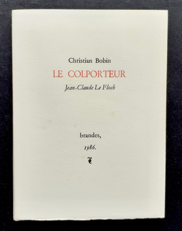 Béthune: Éditions Brandes, Laurent Debut éditeur, mars 1986. Un volume en feuilles sous couverture à rabats imprimée (14x19,5 cm), (50) pages. Édition originale: 1/60 exemplaire de tête sur vélin d’Arches non justifié et sans les deux gravures de Claude Le Floch. Exemplaire signé «Christian». Bon état.