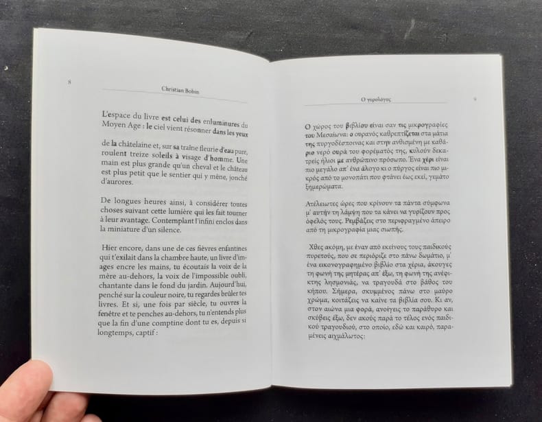 Traduit en grec par Máro Fréri. Édition originale bilingue en français et en grec. Salonique: Éditions de la revue Eneken dirigée par Giorgos Giannopoulos, 2014. Un volume broché (13x17,5 cm), 33 pages. Un portrait photographique de Christian Bobin in-fine. Bon état.