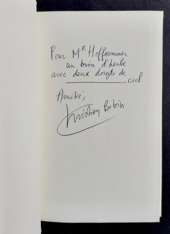 Saint-Clément-de-Rivière: Éditions Fata Morgana, décembre 1990. Un volume broché (14,4x22,5 cm), 48 pages. Tirage ordinaire de l’édition originale: 1/1170 exemplaires sur papier vergé. Avec un envoi autographe signé de Christian Bobin. Discret ex-dono en page de garde. Bon état.