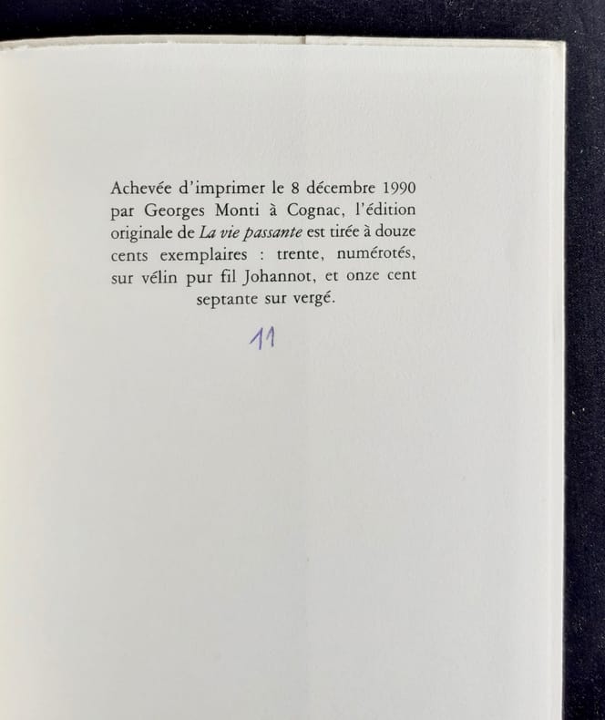 Saint-Clément-de-Rivière: Éditions Fata Morgana, décembre 1990. Un volume broché (14,4x22,5 cm), 48 pages. Tirage ordinaire de l’édition originale: 1/1170 exemplaires sur papier vergé. Bon état.