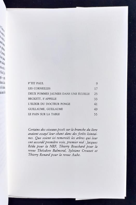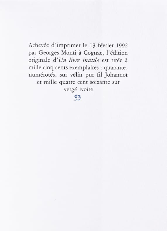 Tirage de tête chez Fata Morgana. Fata Morgana, [imp. Monti à Cognac], (13 février) 1992. 1 vol. (125 x 220) de 67 et (5) pp. Broché. Édition originale. Un des 40 premiers exemplaires sur pur fil (n° 2).