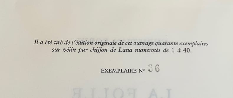 Paris: Éditions Gallimard, juin 1995. Un volume (14,5x21,5cm) broché, de 140 pages. Édition originale: 1/40 exemplaires sur papier vélin pur chiffon de Lana (n°36), seul grand papier. Bon état.