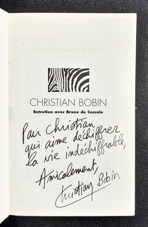 Paris: Centre Georges Pompidou / Bibliothèque publique d'Information (Collection "Les livres de leur vie"), 1994. Un volume 15x10cm broché de 44 pages. Quatre lignes surlignées au feutre sinon bon état. Bel envoi autographe signé de Christian Bobin.