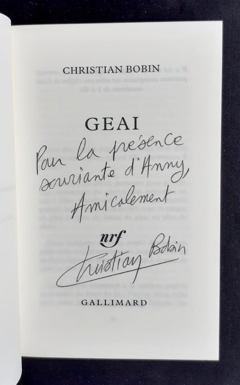 Paris: Éditions Gallimard, novembre 1998. Un volume broché (11,7x18,5 cm) avec son bandeau d’annonce, 112 pages. Nouveau tirage (l'édition originale est parue en juillet de la même année) avec un envoi autographe signé de Christian Bobin. Petites rousseurs en couverture sinon bon état.