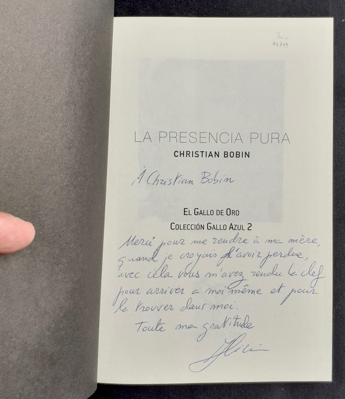 Traduit en espagnol par Alicia Martinez. Bilbao: Éditions El Gallo de Oro, 2017. Un volume broché (14x21 cm), 93 pages. Comprend un entretien de Christian Bobin par Cristina Rodés. Avec des photographies de Maribel Suárez en pleine page. Édition originale espagnole avec un envoi autographe signé de la traductrice adressé à Christian Bobin.