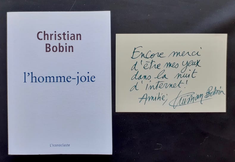 Paris: Éditions L’Iconoclaste, juillet 2012. Un volume broché (14,2x19,7 cm), 192 pages dont 16 pages en fac-similé d’une lettre manuscrite sur papier bleu. Édition originale sur papier courant avec un envoi autographe signé de Christian Bobin sur un papier cartonné de 11x15,5 cm. Exemplaire en bon état.