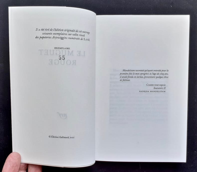 Paris: Éditions Gallimard, septembre 2022. Un volume broché (12,5x19,5 cm), 88 pages. Édition originale: 1/60 exemplaires sur vélin Rivoli des papeteries Arjowiggins (n°55), seul grand papier. Exemplaire non coupé, à l'état neuf.