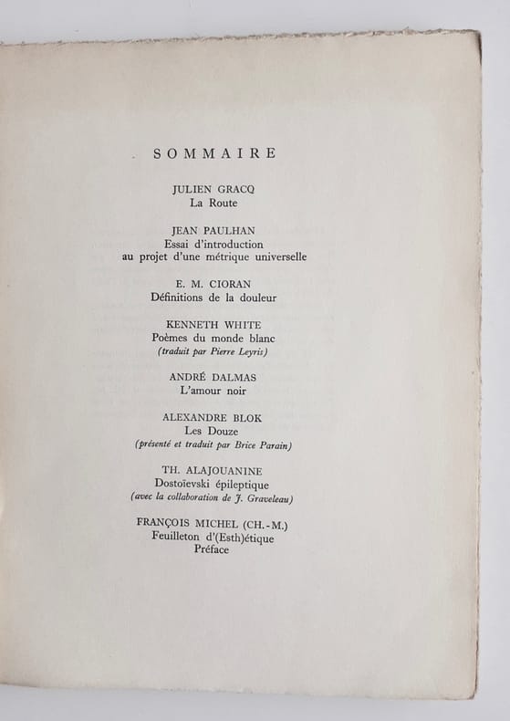 Exemplaire n°00317/1850 sur bouffant édita prioux - Sommaire : la route par Julien Gracq - définitions de la douleur - poèmes du monde blanc - dostoïevski épileptique etc. Classification Dewey : 70.49-Presse illustrée, magazines, revues